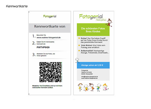 Was bedeutet Onlineverkauf? Bei mir gibt es keine klassischen vorgefertigten Mappen. Jeder kann selbst entscheiden, welches Foto wie oft und in welcher Größe bestellt werden soll. Jedes Kind bekommt seine eigene Kennwortkarte mit einem Passwort zum geschützen Bereich auf meiner Homepage. Nachdem die Fotos bearbeitet sind, können sich die Eltern auf der Homepage einloggen und sich die Fotos von Ihrem Kind und das Gruppen- bzw. Klassenbild ansehen und ganz in Ruhe auswählen. Im Shop können die Eltern dann ganz individuell nach Ihren Wünschen bestellen. Verschiedene Größen an Abzügen, Leinwände und vieles mehr. Nachdem der Zahlungseingang verbucht wurde, beginnt das Fotolabor mit der Produktion und sendet den Eltern anschließend die Bestellung nach Hause.