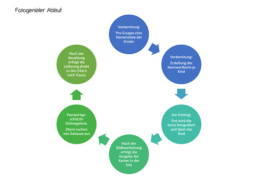 Wie läuft ein fotogenialer Fototag ab: Im Vorfeld erhalten die Einrichtungen von mir die Elterninformation mit Beispielfotos und Infos für den Ablauf für die Erzieher bzw. Lehrer. Am Fototag selbst komme ich morgens früh in die Einrichtung, baue alles auf und beginne dann die Kinder einzeln und anschließend als Gruppe bzw. Klasse zu fotografieren.